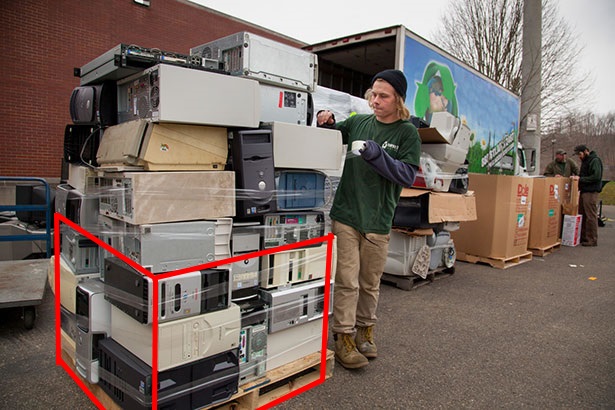 NO, The best possible way to transport LARGE QUANTITY of obsolete computer equipment is on pallets. Gaylord (Bulk) boxes (a 4-cube, heavy cardboard box that is filled on a pallet) provide the best stability.
