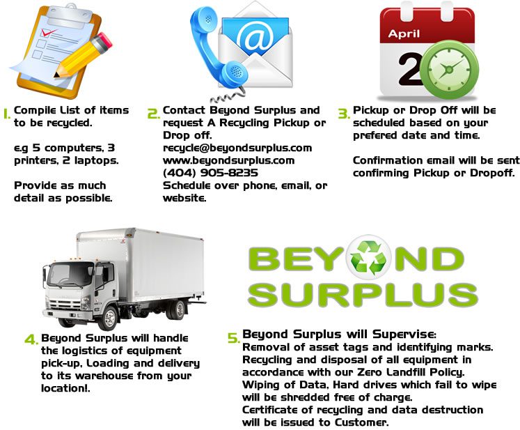 To better assist you, first complete the form by clicking the links above to schedule a pickup. We need to know what equipment you have & how much; attach any inventory list or pictures or Call during business hours if you have questions. After form completion, we will reach out to you and offer alternatives for the safe and secure disposal of your equipment. You can complete the form below or text pictures and your info to CALL OR TEXT: 404-905-8235. Yes, its that easy.